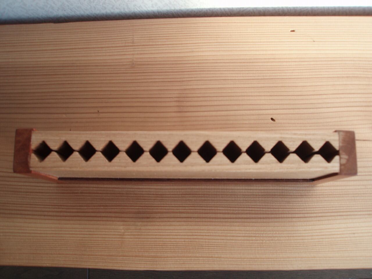 使用材は正面がタモ材、側面がブラックチェリー、下部分がブラックウォールナットで各々色合いが違った材を組み合わせて作っています。
